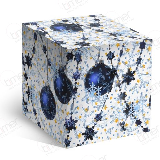 Стильная новогодняя упаковка, выполненная в классической зимней гамме. Дизайн с изображением насыщенно-синих елочных шаров, ледяных снежинок и золотистых звезд создает атмосферу главного праздника года. Эта коробка — идеальный выбор для оформления новогодних подарков коллегам, друзьям и близким.